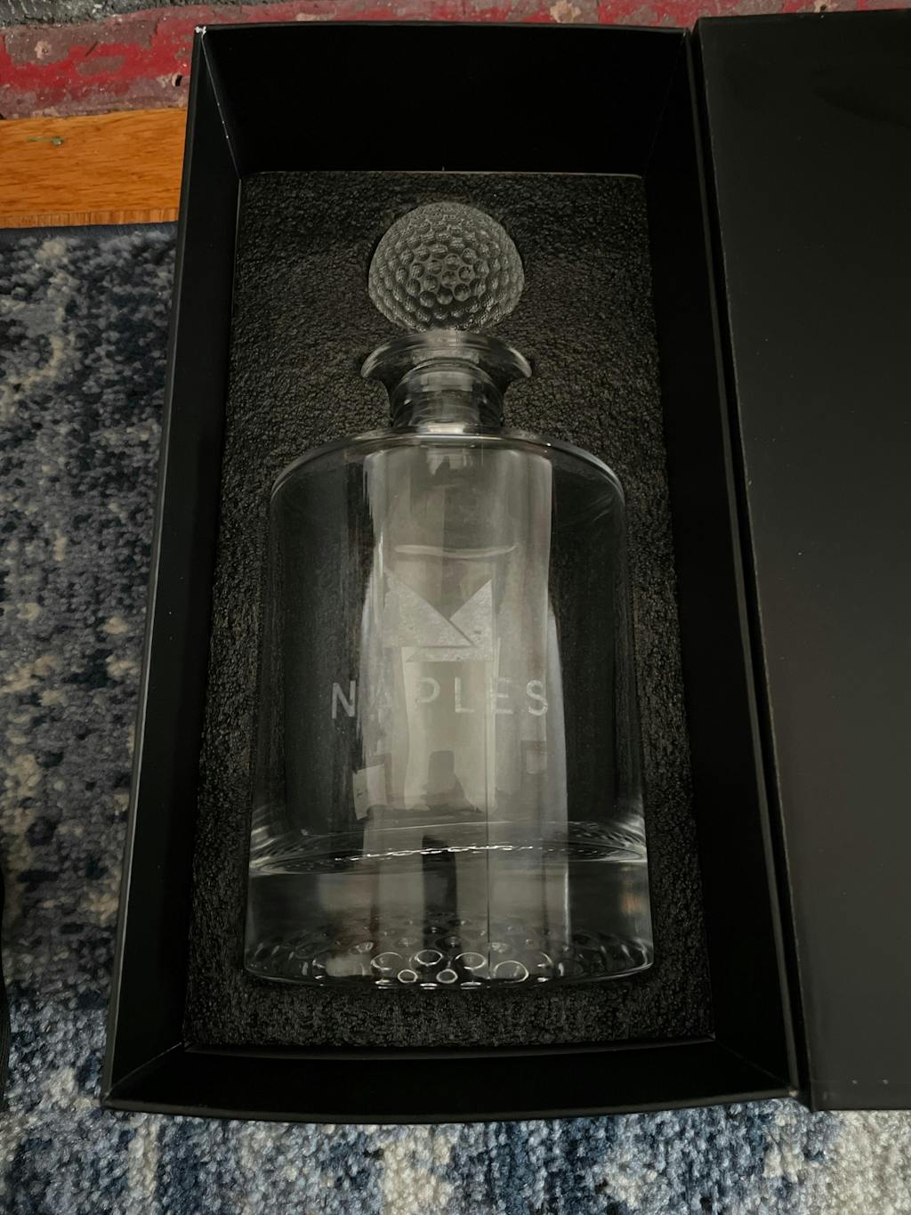Crafted with a heavyweight feel, the decanter features a golf ball–textured stopper lid and matching dimpled bottom, echoing the form and feel of the game. Whether he’s toasting a great round or pouring a nightcap, it delivers statement-making style every time.