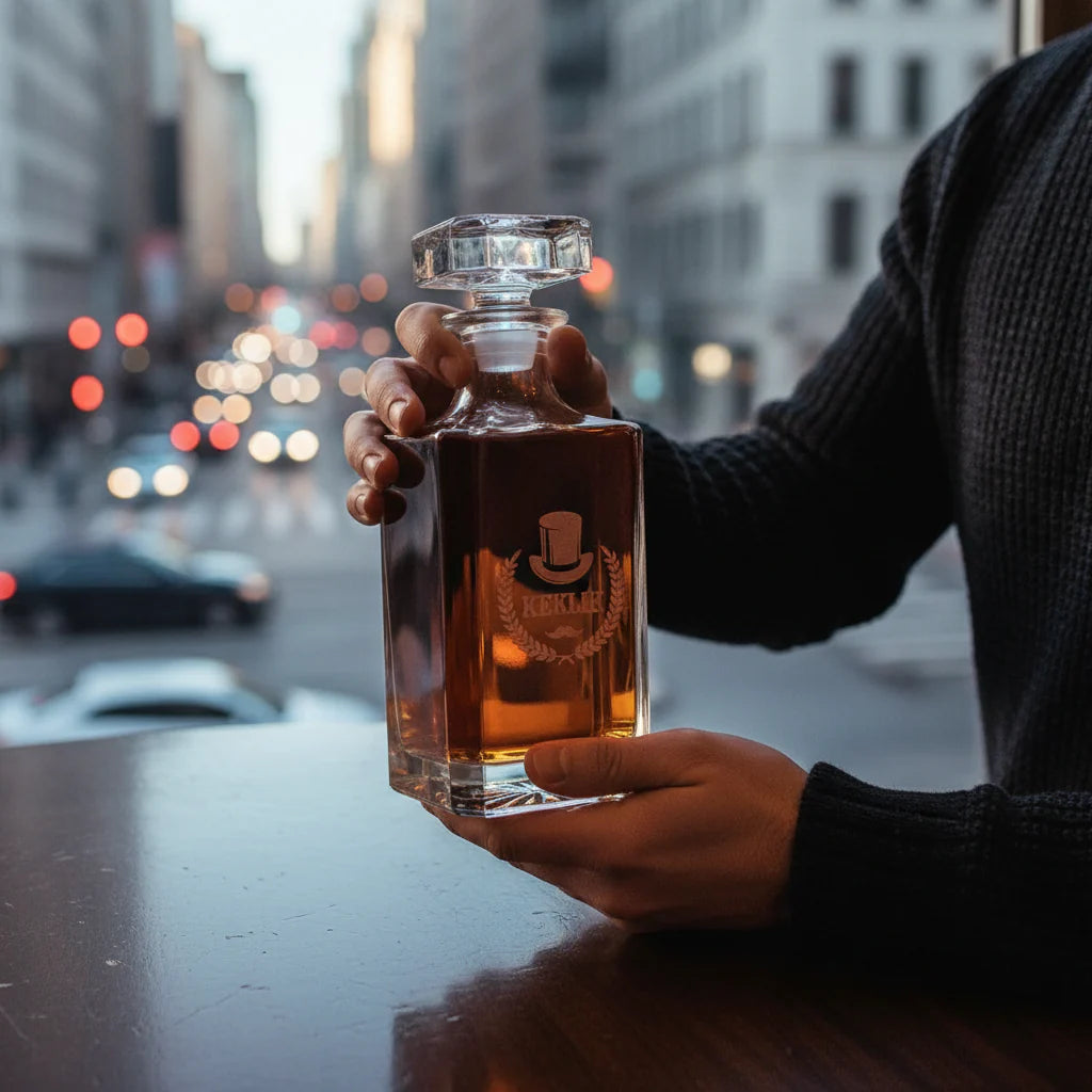 Turn your groomsmen into philosophers with this custom engraved decanter gift set. The handmade crystal decanter holds 26 ounces of whiskey or bourbon, complemented by a pair of personalized whiskey glasses.