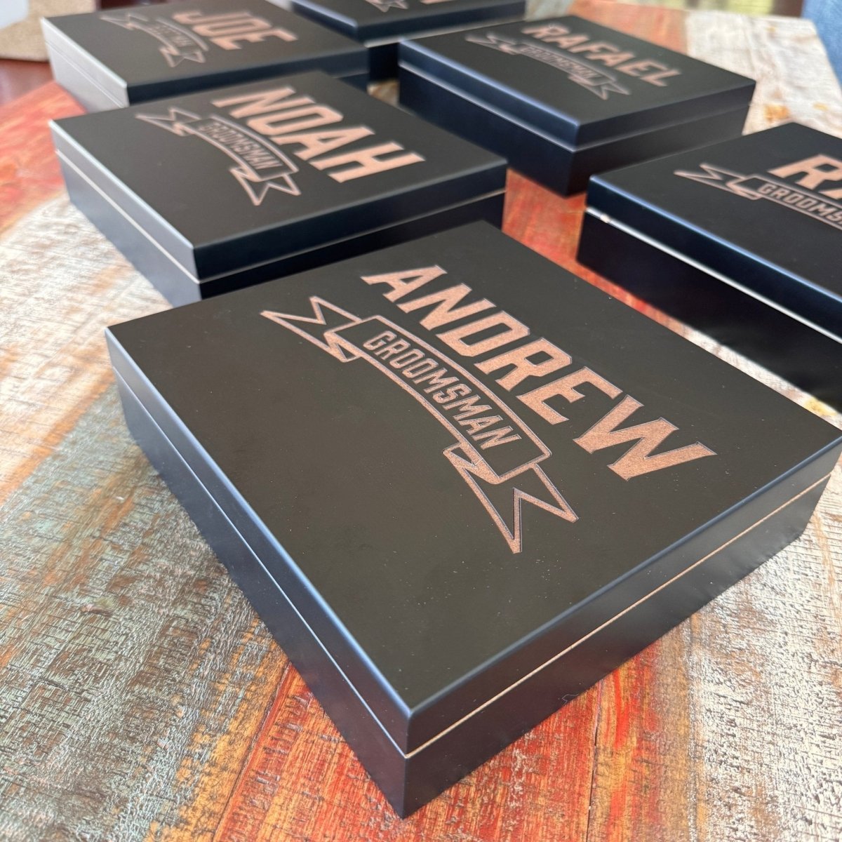 Simply enter your guy's name and wedding role in the personalization boxes that appear above the add to cart button and our team will put it on top of the humidor box. If you do not want personalization on it you can leave that field blank.
