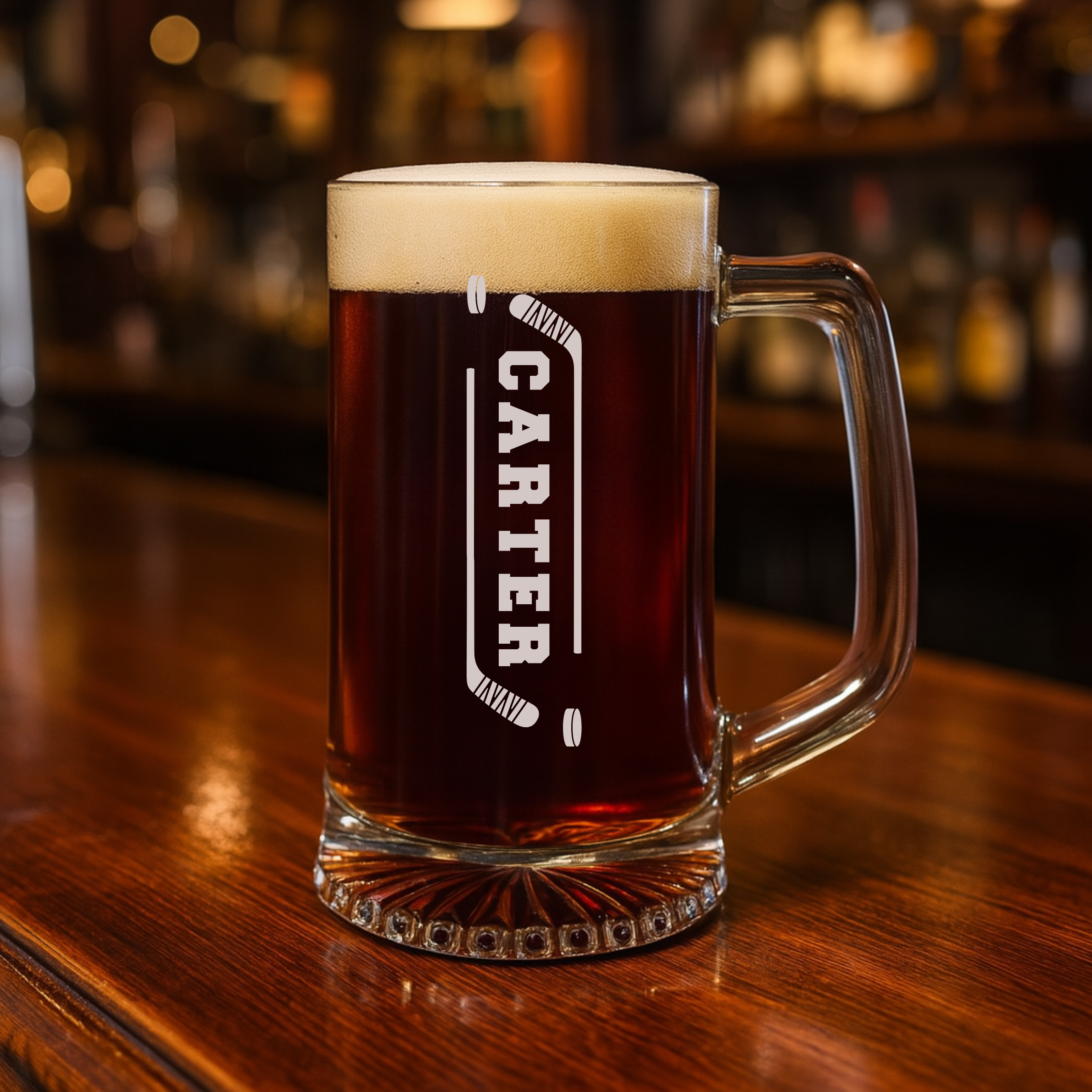 The centerpiece? A heavy-duty beer mug engraved with your buddy’s first name, last name, or nickname (up to 15 characters), frosted between two hockey sticks down the side. It’s big, bold, and built for guys who know how to raise a glass—and a little hell. Add in the personalized card with his role, name, date, and your event name, and you’ve got a proposal that hits harder than a slapshot.