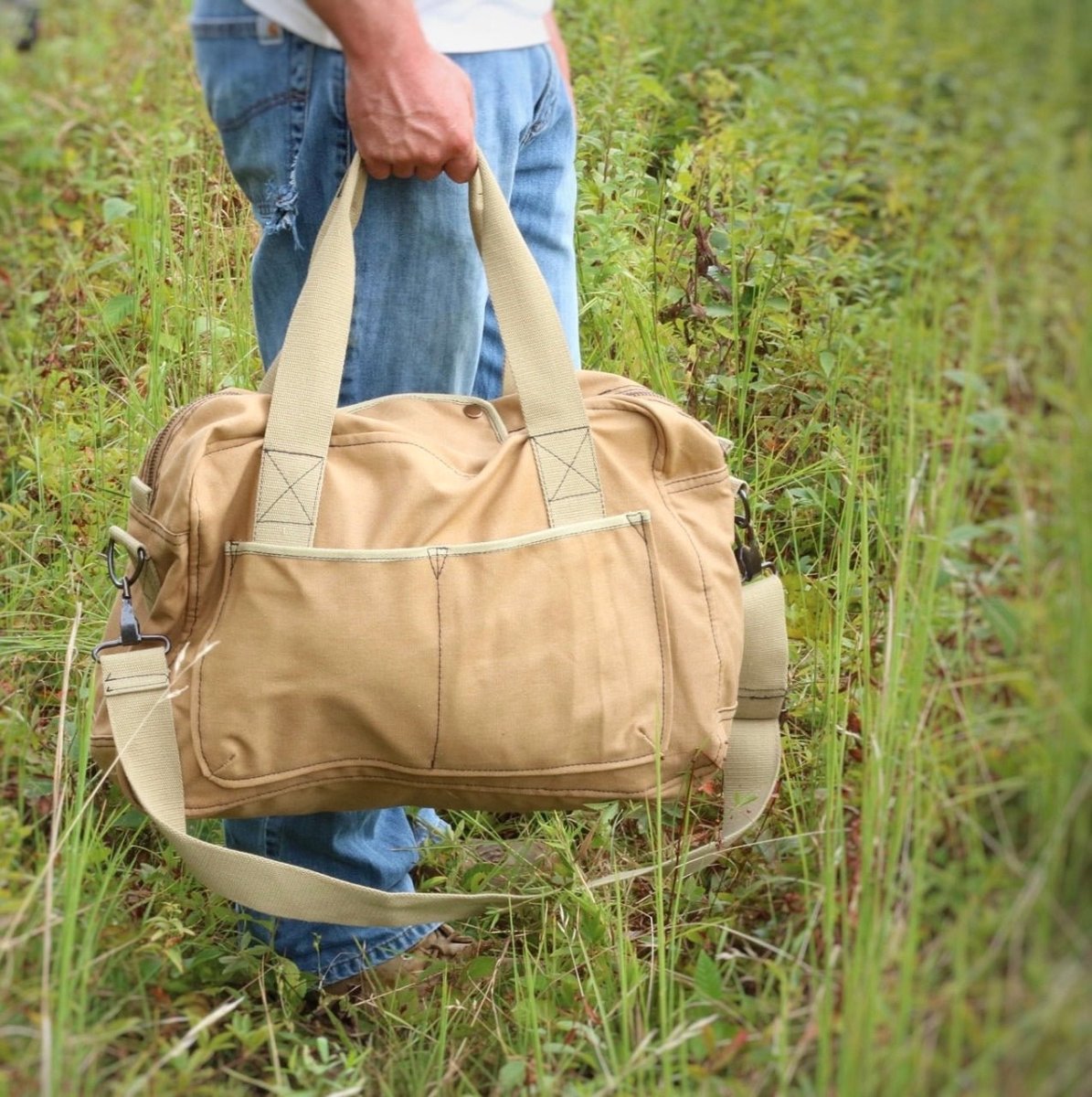 This is a great canvas, Duffel. Very sturdy material and cleverly designed. It looks great...down to business looking.