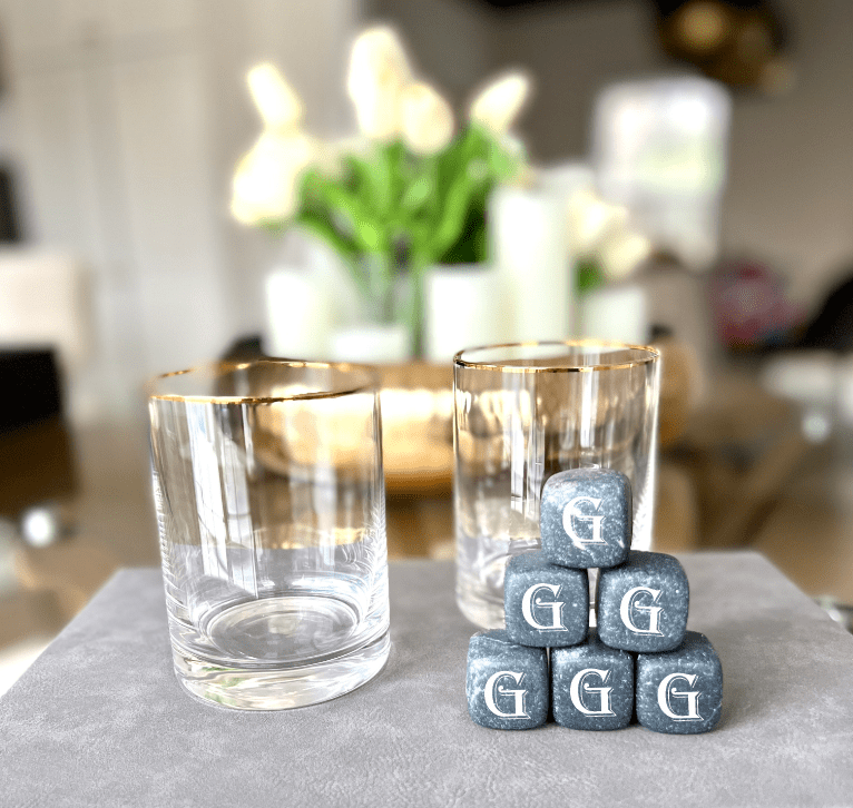 They are clean-cut natural stones that are used to chill whiskey and other spirits. They vary in size and are designed to be stored in the freezer. Whiskey stones are added straight to your shot of whiskey, scotch or bourbon to chill them without having to dilute the drink. Add a set of personalized stones to collection of whiskey, low ball glasses, and decanters and you will have one happy man!