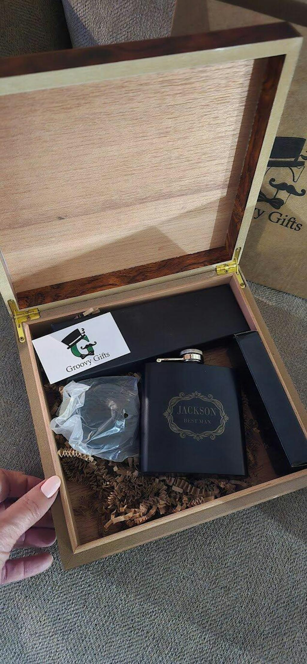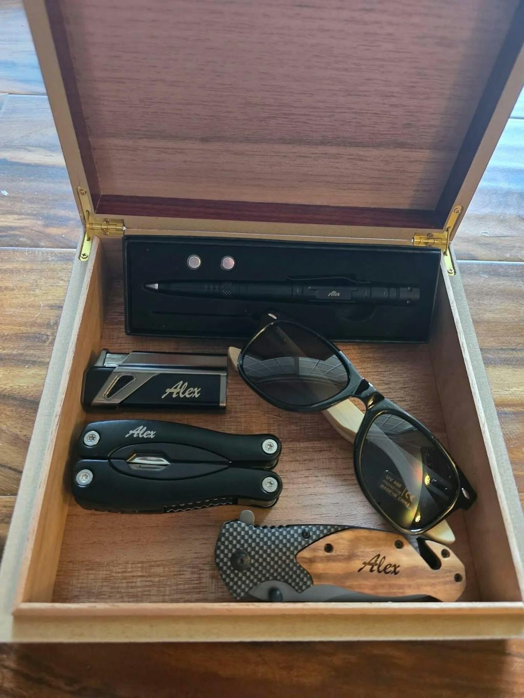 My husband was so excited about the custom engraved box filled with useful items with his name on each item. We chose the knife, Swiss army tool, flashlight pen & a fancy lighter. It was better than I expected, and this company really helped me put together a gift for my husband’s birthday that was a hit.