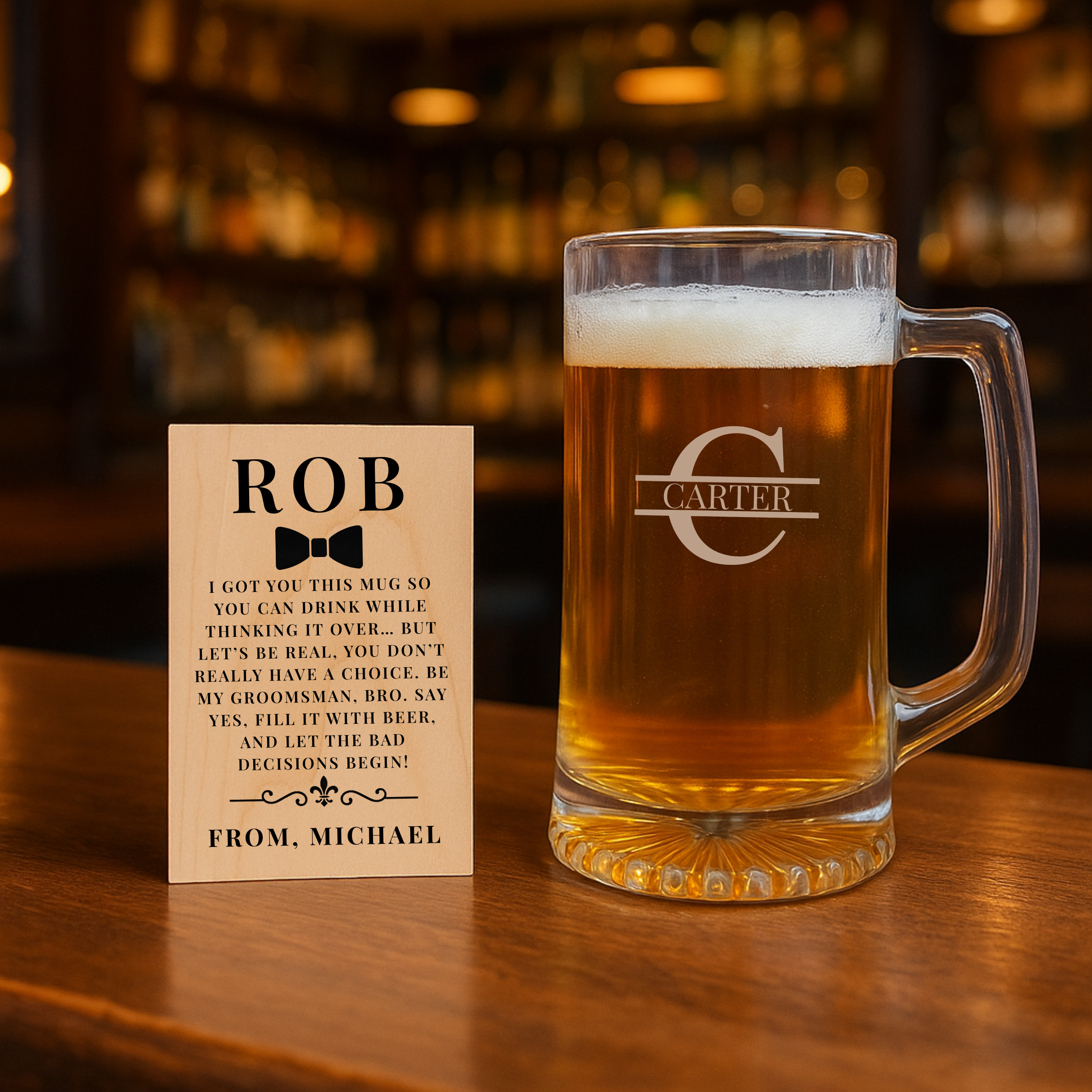 This isn’t just a gift — it’s your official call to arms. Rally your best guys with the Chug & Cheers Proposal Set, a bold, personalized way to ask your friends to stand beside you on the big day. Each set includes a heavyweight 25oz beer mug engraved with their name and initial — perfect for toasts, bachelor parties, and legendary chug videos. Add a personalized wooden card with their name and your own custom message: funny, heartfelt, or straight-up wild. Whether you want to make 'em laugh, cry, or chug a cold one on camera, this set says: You’re in. Let’s make it count.
