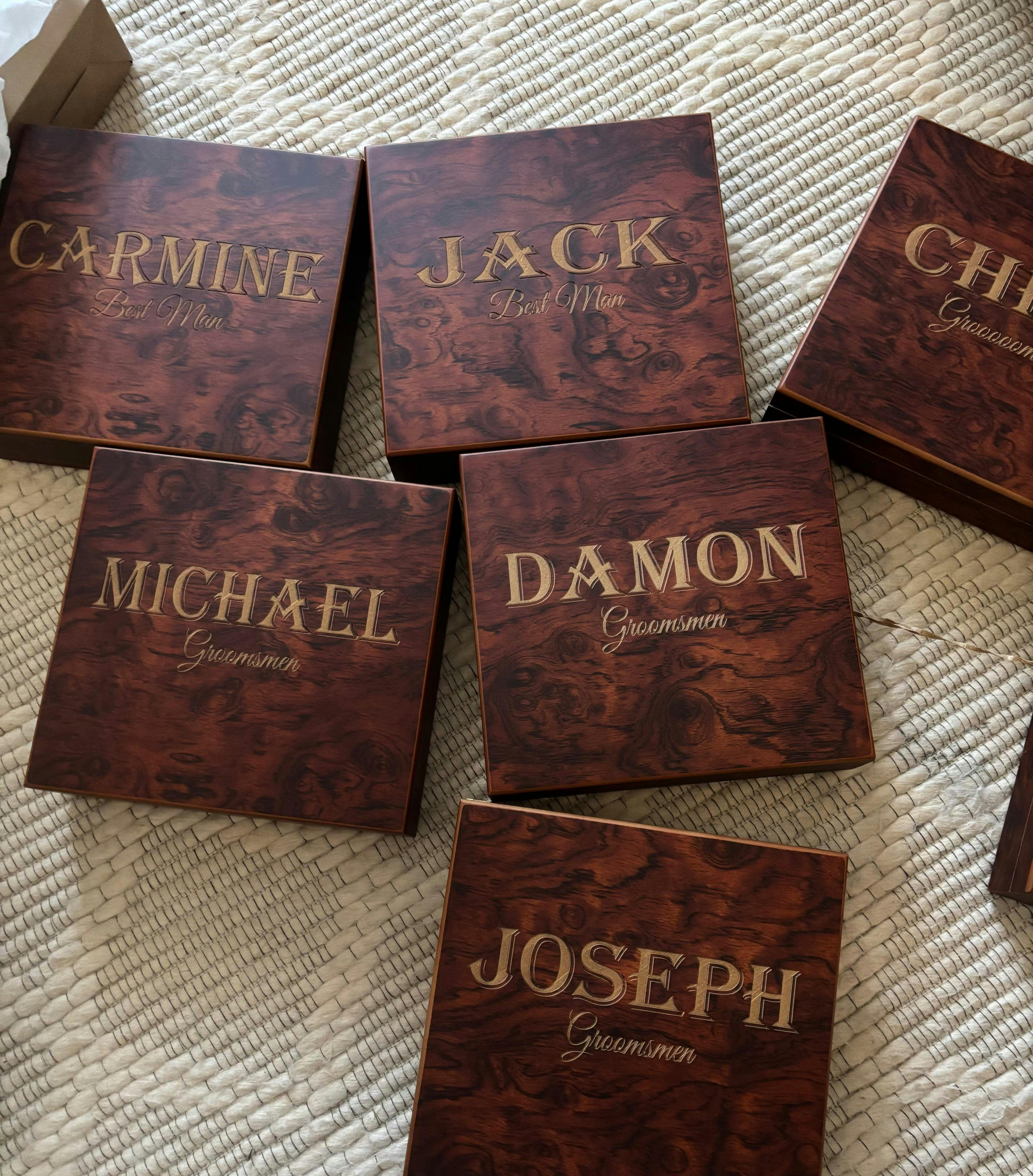 Personalization is included with your order. Follow these steps to order this groomsmen box gift set: