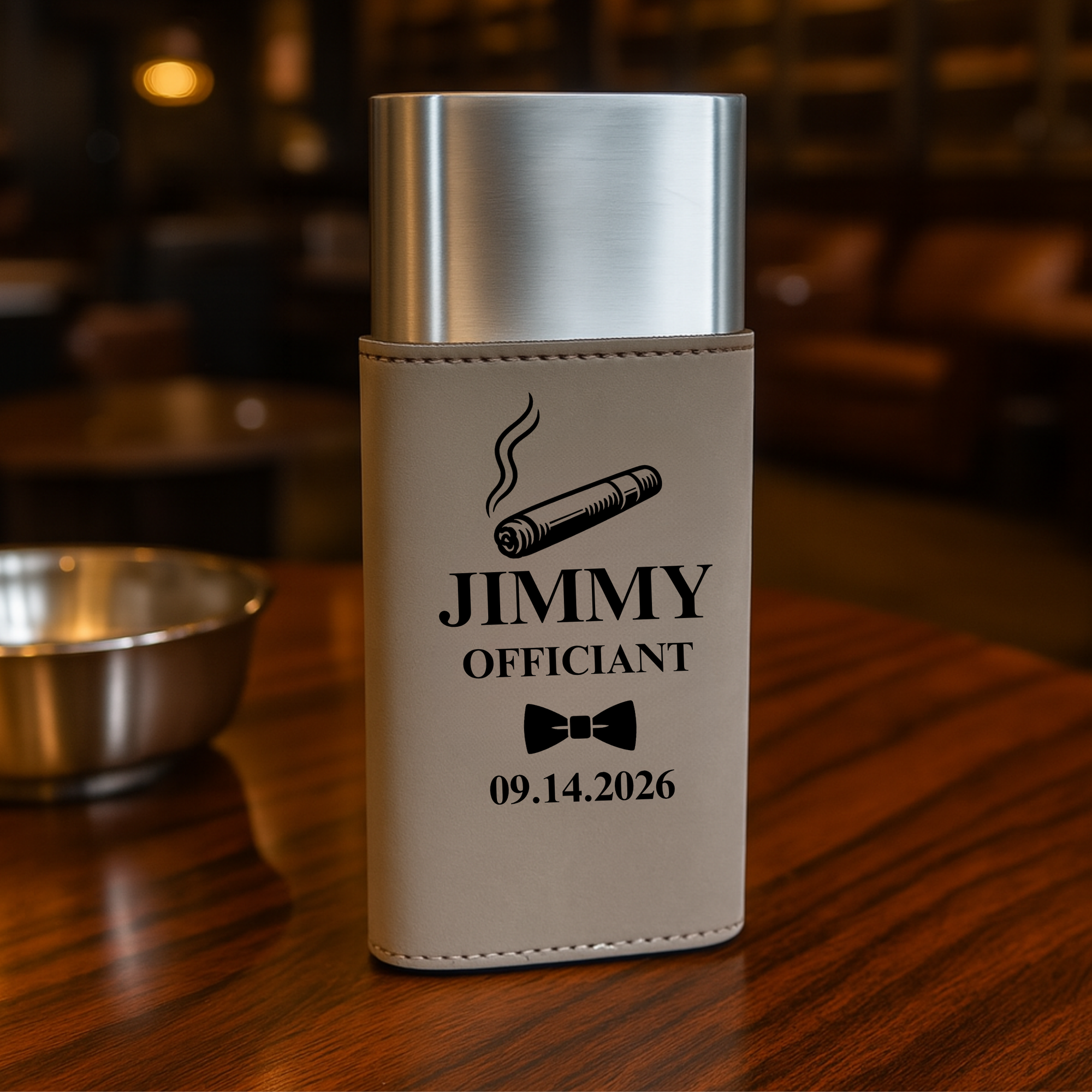 Sleek faux leather + stainless steel cigar case with custom engraving