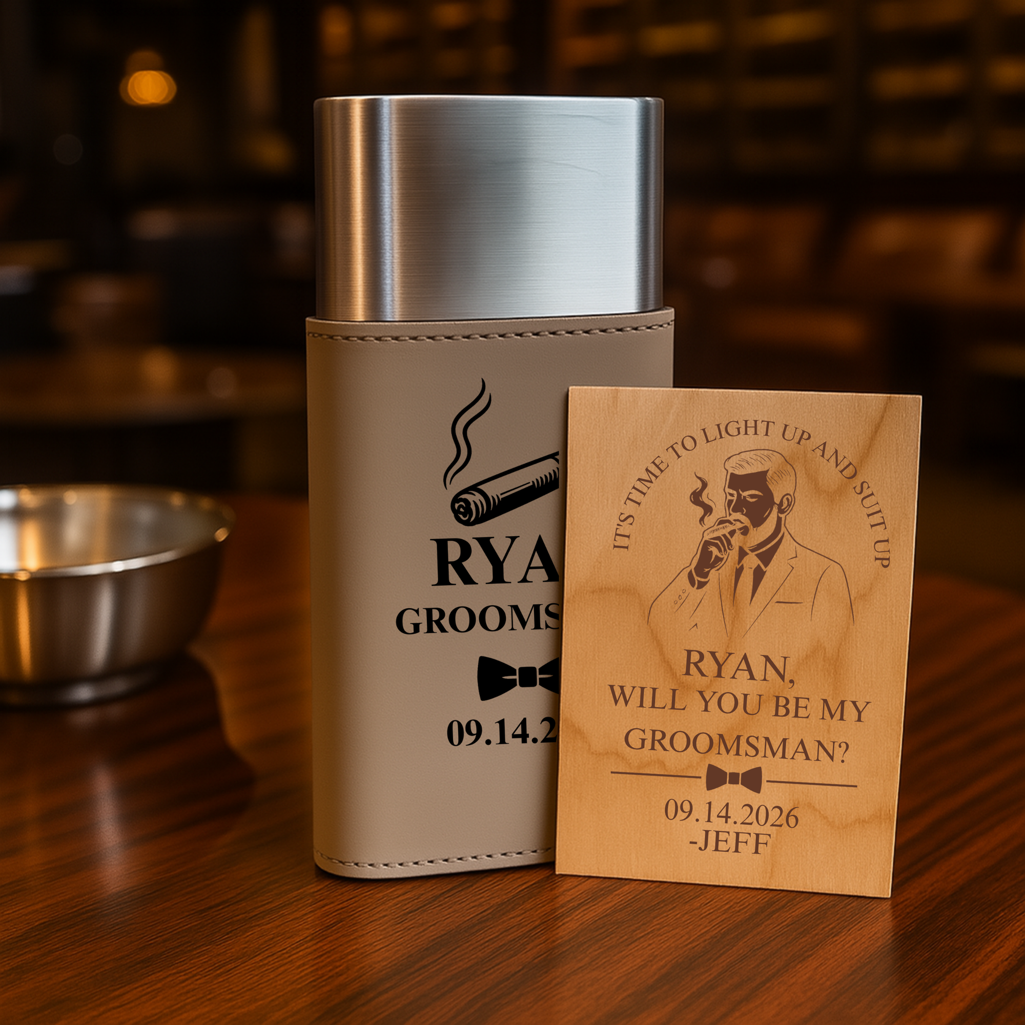 It’s time to light up and suit up — but first, let’s make it official. Whether he's your Best Man, Groomsman, Usher, or Officiant, this cigar gift set turns your ask into a moment he’ll never forget. Featuring a sleek, travel-ready cigar case and a custom wooden proposal card, this set is equal parts style and sentiment. It’s a nod to your friendship, your big day, and every good smoke you’ve shared. Personalized with his name, role, and your wedding date, this gift makes the moment feel as legendary as the guy you’re giving it to.
