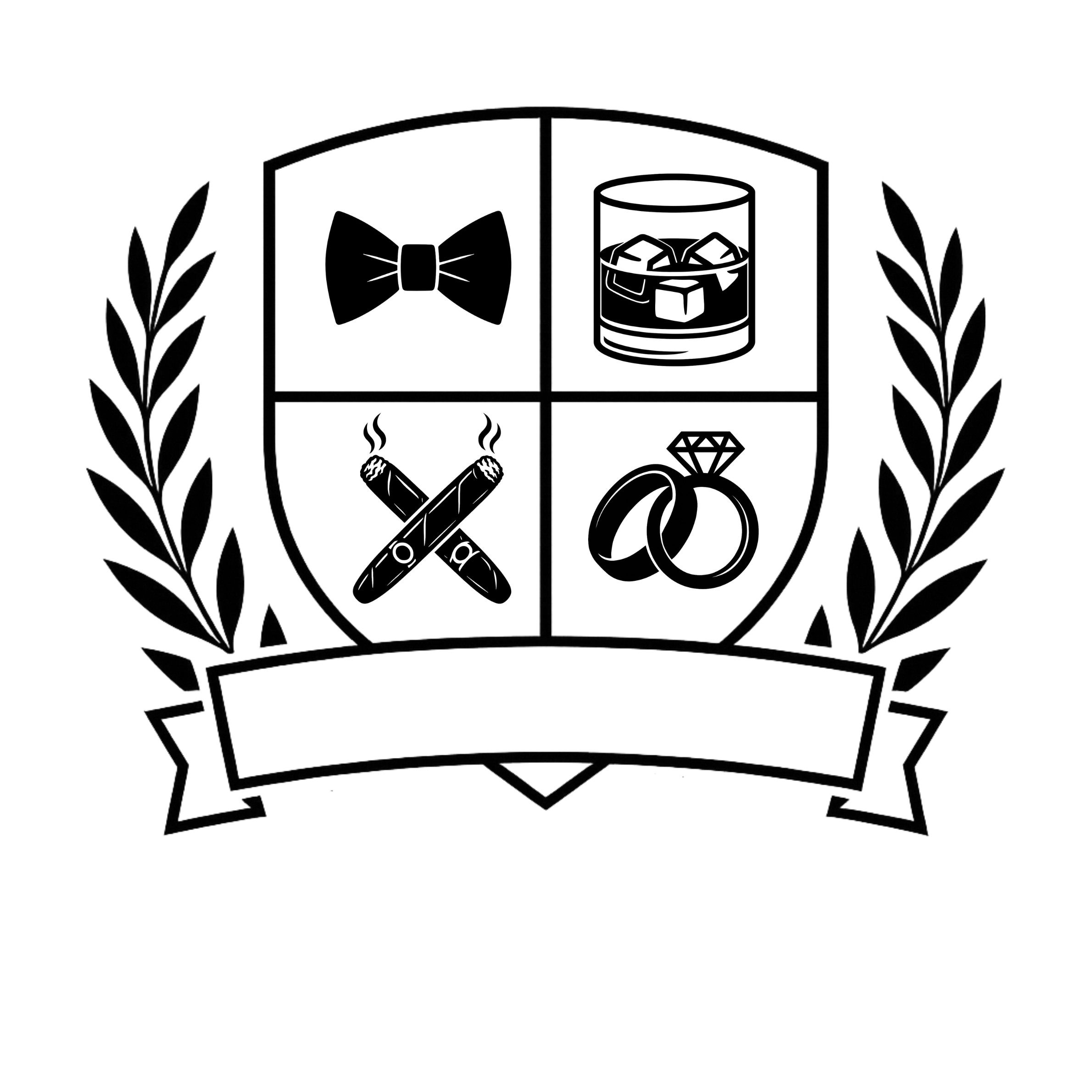 Wedding Party Crest design featuring bowtie, cigars, whiskey glass, and rings