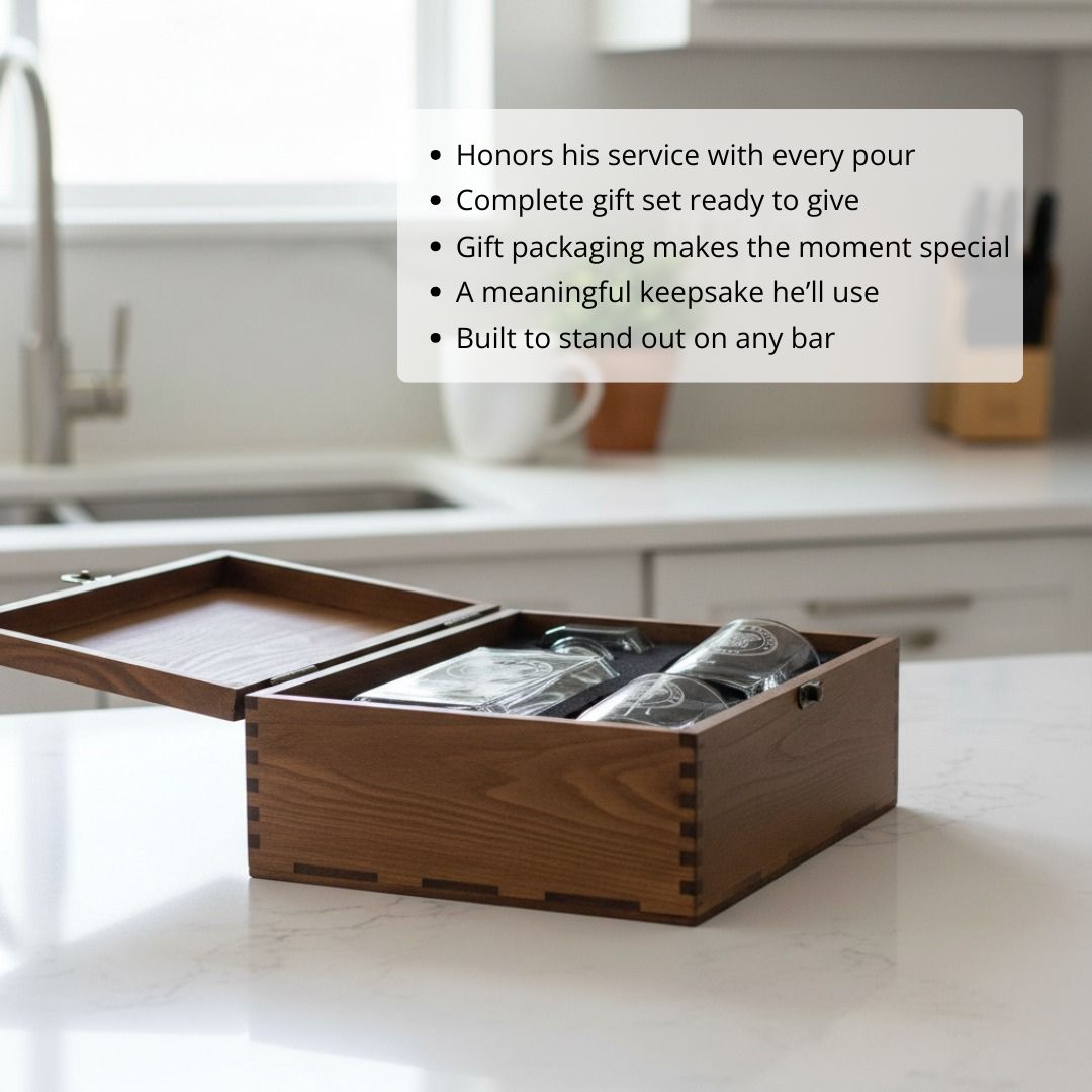 Raise a glass in honor of service with the Military Whiskey Decanter Set—a powerful combination of elegance and respect, crafted to celebrate the dedication of those who’ve served. As he pours from the weighty decanter into the matching glasses, he'll know this isn’t just barware—it’s a heartfelt tribute. Whether it’s for retirement, a birthday, or a service milestone, this set turns every toast into a moment of recognition and pride.