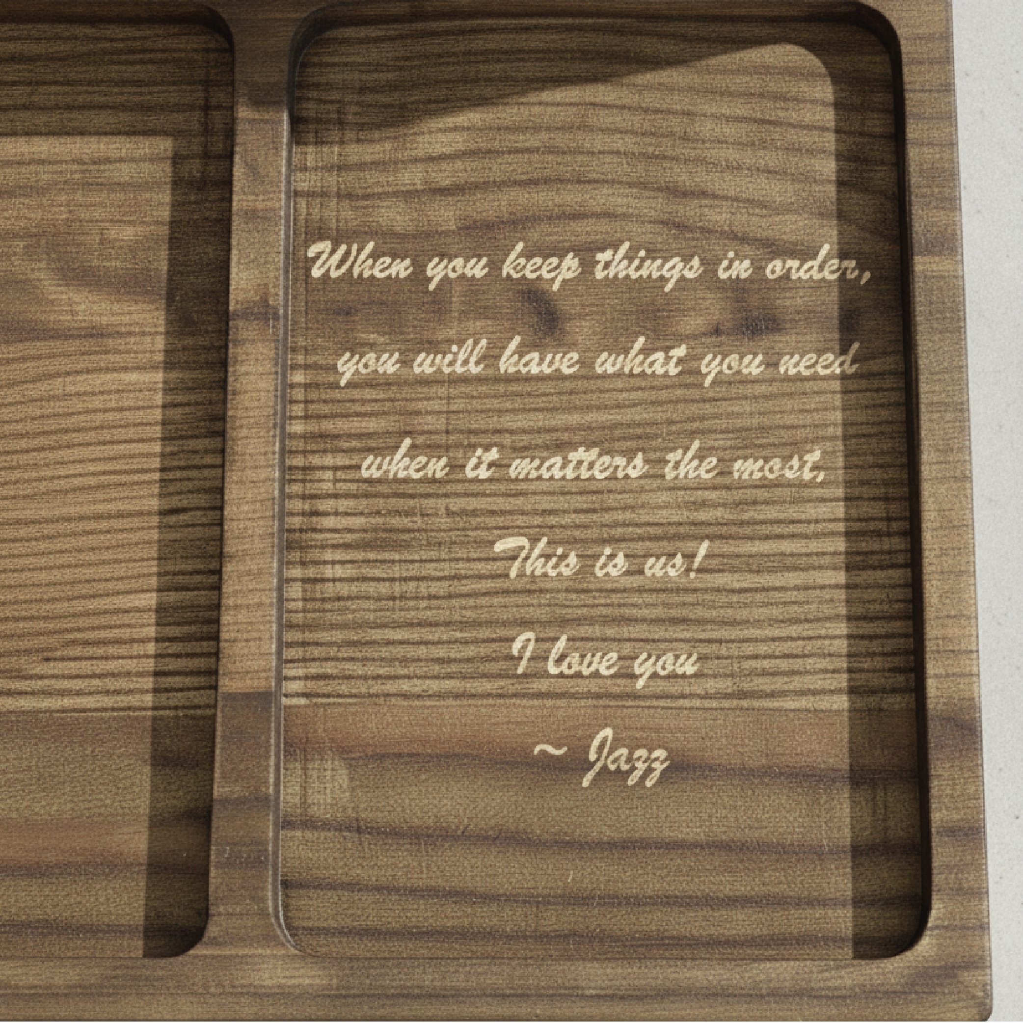 This wood docking station can be engraved with just a name on them and you can add custom text on the tray. The name in the middle can fit up to 20 characters. The optional line on top of the name can fit up to 30 characters, and the optional line at the bottom of the name in the middle can fit up to 120 characters, allowing you to put a custom message at the bottom. Follow the example below when adding your guy's details.