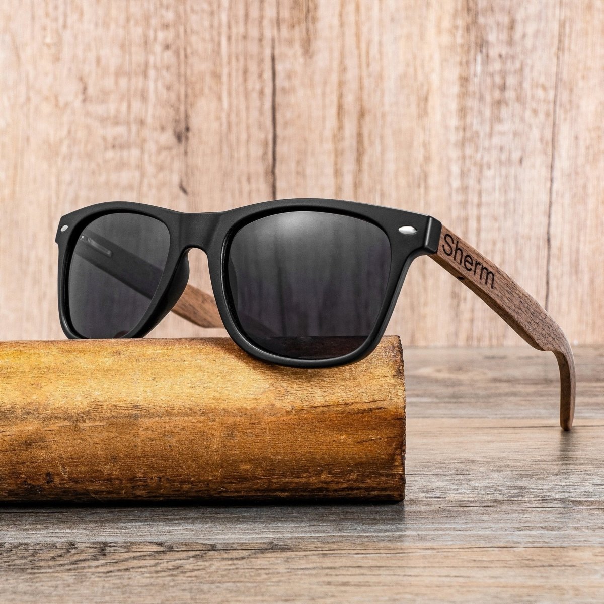 The set also includes a pair of sunglasses that are not only functional but also fashionable. The sunglasses feature wooden frames that are engraved with the same design as the box and flask, adding a cohesive and stylish look to the set. The UV-protected lenses provide optimal eye protection while the wooden frames add a touch of eco-friendly luxury.