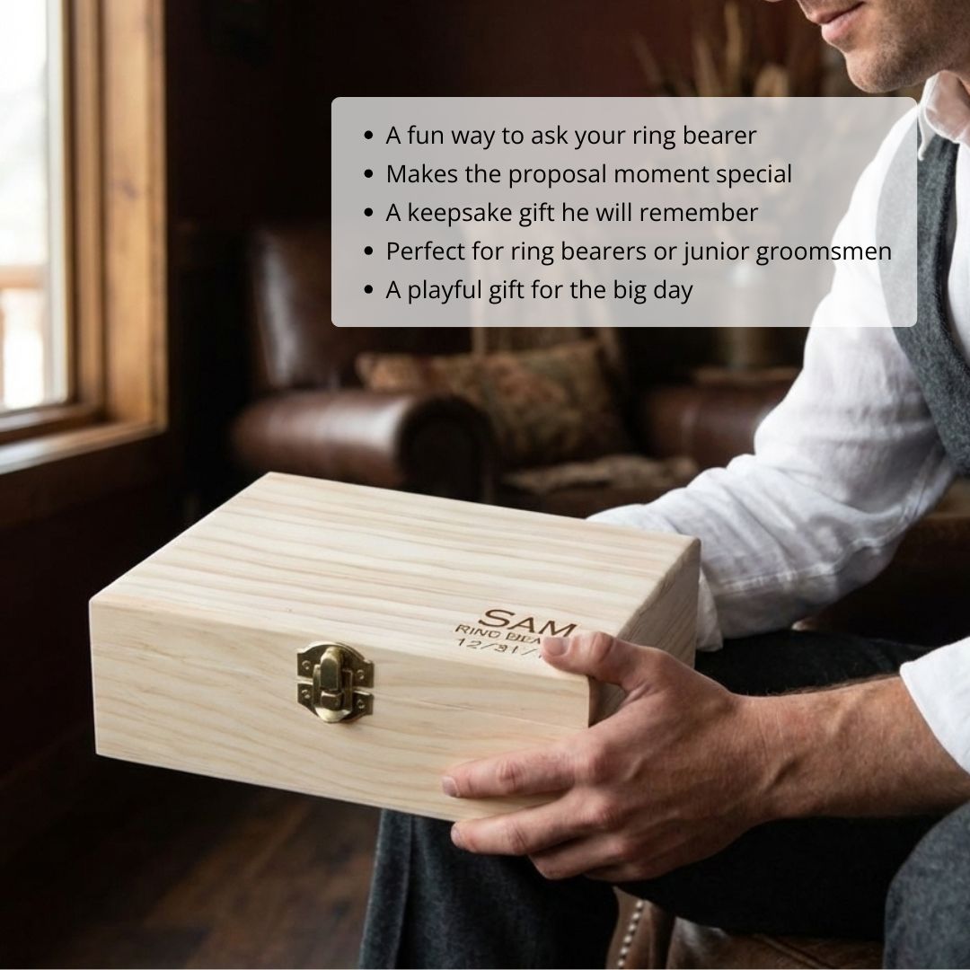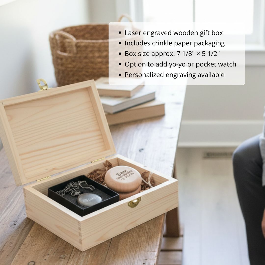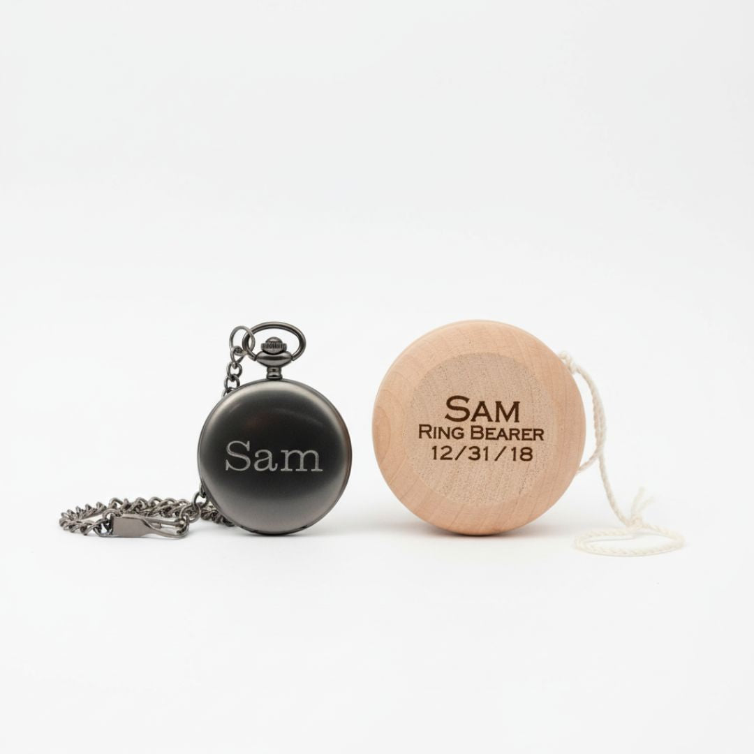 Searching for the Perfect Ring Bearer Gift? Our Personalized Gift Sets Make Great Gifts for Your Ring Bearer or Junior Groomsman. Each Wood Gift Box is Engraved with a Laser Creating a Crisp Finish. Included is 1 Wood Gift box with crinkle paper with the option to add a Yo-Yo or Pocket Watch, or Both.